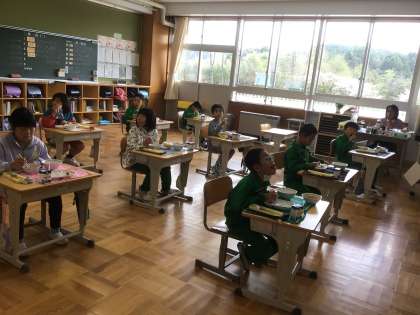 今年度初めての給食 公開日 2024/04/09 更新日 2024/04/09 お知らせ 今日のメニューは焼きそば、ぎょうざ、米粉パンです。みんな楽しみにしていました。特に1年生は、学校での初めての給食。「早く食べたいね」。当番活動も初めてです。エプロンのたたみ方を教えてもらって、上手にたたんでいました。給食当番さんたちが席に着いたら、みんなで「いただきます」。 どのクラスも、今年初めての給食をおいしそうに食べていました。