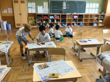 2年生は、今週金曜日に1年生と学校探検をするそうです。そのときに1年生にプレゼントするおもちゃを、一生懸命作っていました。試しに、そのおもちゃで遊んでみる子もいましたよ。