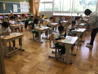 3、4年生は、先日届いたばかりの新しい漢字ドリルに取り組んでいます。やり方を先生に教えてもらって、さあ、スタート。ここから、学年の新出漢字の学習が始まります。