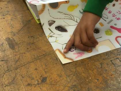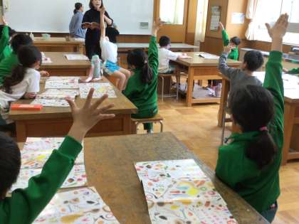 1、2年生の図工は、学習の始まりにあたって、教科書からいろいろなものの形を見つけて発表していました。おはじき、パン、野菜、いろいろなものの形が教科書に載っています。「ハイ」「ハイ」と手を挙げる元気な声が、学校中に響いていました。