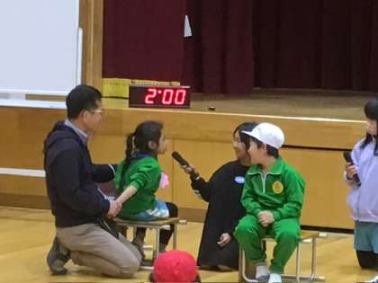 まず、新入生入場です。6年生のあとについて、1年生のみんなが1列に並んで入場してきました。その後、インタビューで、1年生一人一人に「名前」「好きな食べ物」「将来なりたいもの」を聞きました。将来なりたいもので「学校の先生」との答えが1年生から出たときは、会場の先生も子どもたちもみんな、「おお〜!」と声を上げてしまいました。