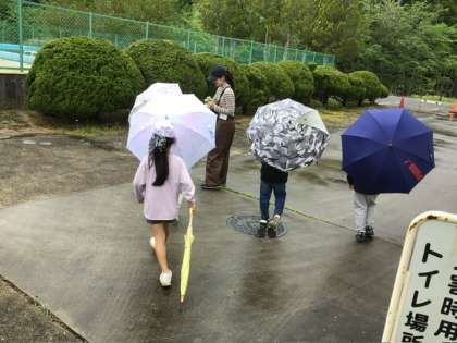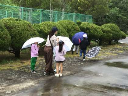 ゴールデンウィークの間の授業日です。今日は雨模様。その中を、1年生が傘をさして歩いていました。生活科の「生き物を見つけよう」の学習です。シロツメクサで作った飾りやダンゴムシなどを大事に持っていました。「先生、この草は食べられるんだよ」と教えてくれる子もいました。