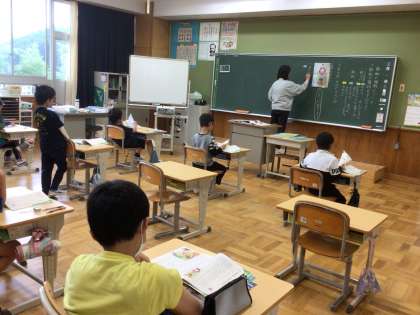 3、4年生は道徳科の勉強です。読み物を使って、登場人物の行動や気持ちを追いながら考えます。今日は、植物のお世話を通して、自然愛護の心情を育てる読み物でした。なかなか息の長い意見を発表する子もいました。