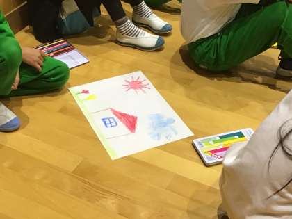 学年ごとにグループに分かれて、『描いてある絵を見て、それを自分たちで再現する』ゲームをしました。「赤い花があった」「雲は青だった」と、テーマの絵を覚えて紙にみんなでかき、チームワークを発揮して取り組むことができました。