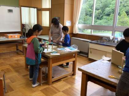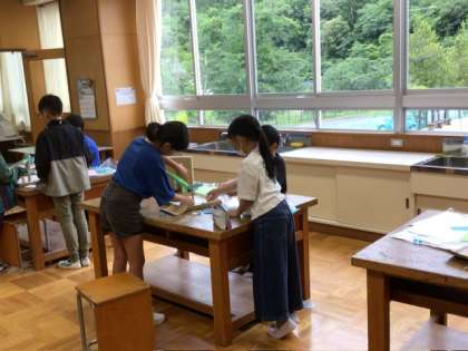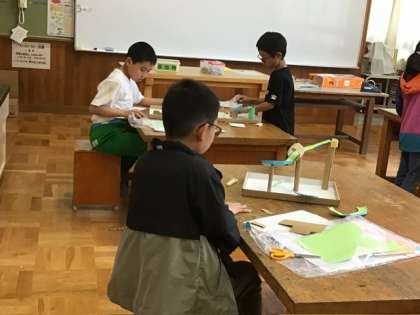5月31日 3、4年図工「コロコロガーレ」 公開日 2024/05/31 更新日 2024/05/31 お知らせ 3、4年生が、図工でビー玉を転がす仕掛けを作っていました。紙をうまく作って高い位置から滑り台のように転がす道を作ったり、回転コースターみたいなカーブの道を作ってうまく転がしたり。 仕掛けを考えて、作って、自分のイメージどおりにビー玉が転がると嬉しいですね。 みんな楽しそうに作っていました。