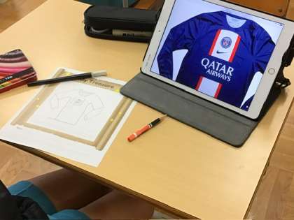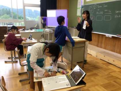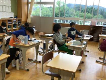 5、6年生はカードにアルファベットで自分の名前を書いたり、「宝物」を紹介する別のカードを作ったりしていました。カードを作るのに学習用タブレットで画像を調べて参考にしている子もいます。