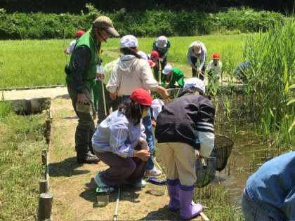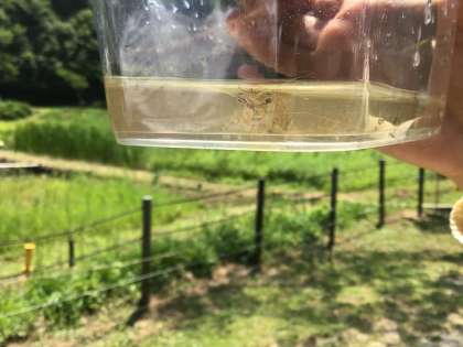 広い森の中で、「トンボの湿地」が今日の活動場所です。網を湿地に入れてがさがさ動かすと、おたまじゃくしやどじょう、エビなどが網に入りました。それを、1人ひとつの観察ケースに移し、自分の見つけた生物をじっくりと観察します。