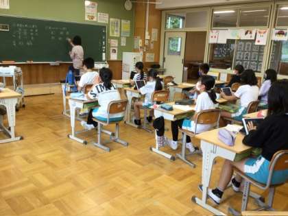 5、6年生は書写の授業。終わり頃には、「季節を感じる漢字」や「魚へんの漢字」など、いろいろな漢字を集めていました。「魚へんに、参加の参で、アジだよ」など、タブレットを取り出して、たくさん調べられるところは、さすが今の時代の子だなと感心しました。