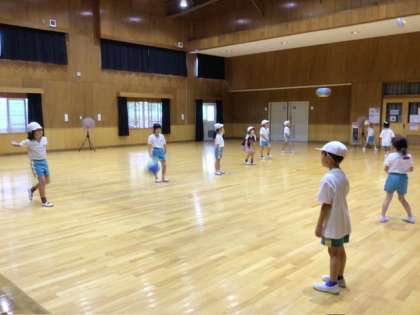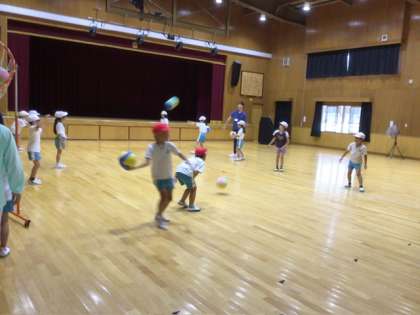 1、2年生は、プールがなしになったので、体育でボールを使った運動をしました。自分の思ったようにねらったところを目指して投げたり、上手に受けたりする基本をやりました。