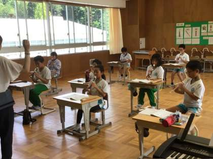 3、4年生は、音楽でソプラノリコーダーの勉強です。高いレの音をマスターするために、「かっこう」の曲で練習していました。