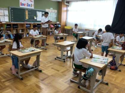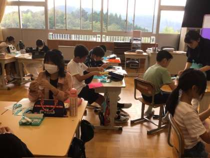 今日は12年生は体育で、ねらった的にボールを当てる活動を通して、グループごとに得点を競っていました。34年生は理科で、自然の生き物がどのようなところにいるか、教科書の絵を見ながら出し合っていました。56年生は家庭科です。先週に比べて、自分の作品が形になってきた子が増えてきました。針と糸の扱いにも慣れてきたでしょうか。
