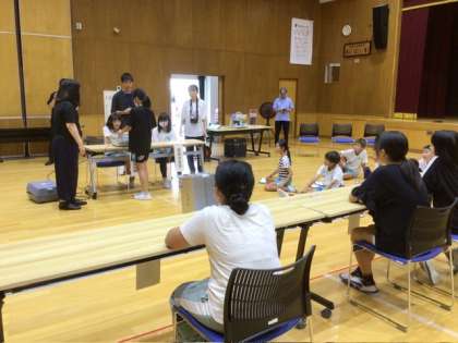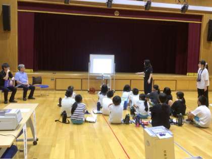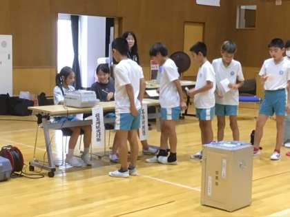 今日は5、6年生を対象に、豊田市選挙管理委員会の方の出前授業「選挙出前トーク」がありました。選挙の投票所で使う本物の物品を持ち込んで準備してくださり、多目的ホールが投票所のようになりました。