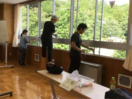 今までの作業内容と違って室内での作業でしたが、皆さん一生懸命取り組んでくださり、テラスも窓もきれいになりました。窓から向こうに見える木々の緑がひときわ鮮やかに見えるような気がします。