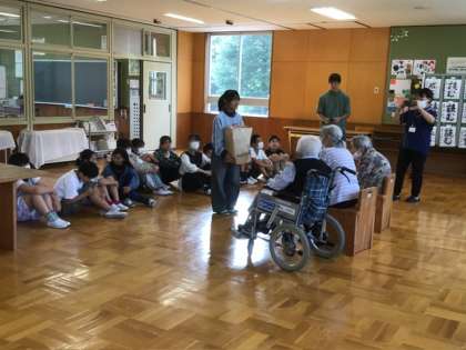 午後は、まどいの丘の職員さんと利用の方々が、手作りの雑巾を袋いっぱいに持って来てくださいました。代表して5、6年生で受け取りました。お年寄りへの質問タイムもあり、和やかな時間でした。まどいの丘の皆さん、ありがとうございました。