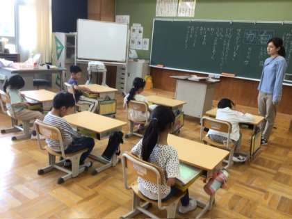 1、2年生は午前中、校外学習でした。自然観察の森で秋の生き物はたくさん見つけられたでしょうか。1年生の午後の授業の様子を見てみました。校外学習後で疲れていても、先生の指示にしたがって「聞く姿勢」が整えられていましたね。