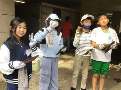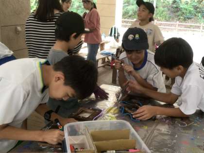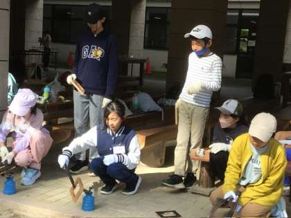 バーナーで木枠をあぶり、タワシや布で拭いて木枠の木目を浮き立たせます。それに自分の好きな絵をポスカで書いて出来上がり。絵の代わりに、所員さんや先生たちのサインを書いてもらう子も多かったですね。すてきなおみやげ、帰ったら家族に見せてくださいね。