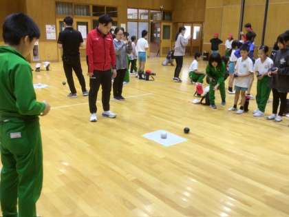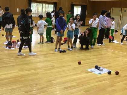 パラアスリートに学ぶ会2 公開日 2024/10/31 更新日 2024/10/31 お知らせ ボッチャ体験をしました。 全校縦割り班で対戦しました。ボッチャは、カーリングに似ていて、コートの中にある基準となる白ボールに、なるべく近くなるように自分の球を投げます。 みんな、投げた球がどこで止まるのか見届けて、チーム全員で喜んだり励ましあったりしていました。