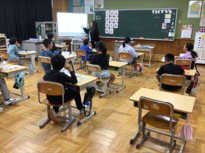 3、4年生の外国語活動の写真も掲載しました。今日はALTの先生が来てくださいました。写真では音声が伝わらないのが残念ですが、先生の問いかけに、英語で答えたりリアクションしたり、みんな元気に取り組んでいました。