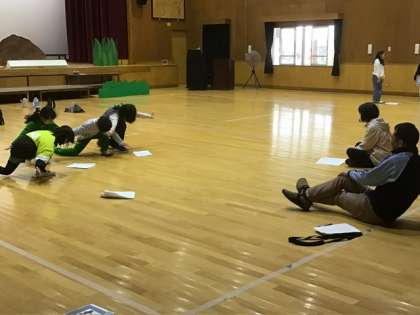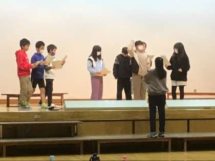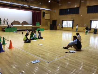 1、2年生の練習風景…今週初めに見た時は、ワークスペースで丸くなって台本を読み合わせていましたが、今日はセリフに動きをつけて練習していました。すごいですね。