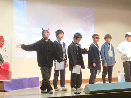 5、6年生の「夢から醒めた夢」です。ダンスあり歌あり、セリフも動きも、さすが高学年!という上手さでした。霊界空港で登場するいろいろなキャラクターがみんなユーモアたっぷりで楽しく、でも家族の絆でほろっとするすてきなお話でした。最後のメッセージに込めた子どもたちの思いを感じ、会場が感動に包まれました。