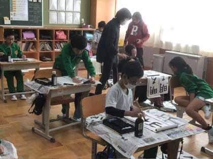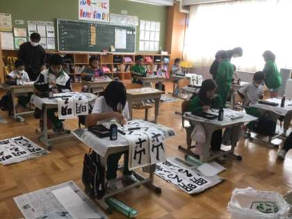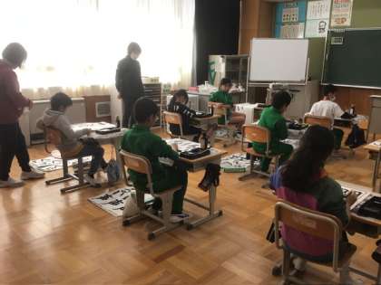 3、4年生の授業では、2名の書写ボランティアの先生方が子どもたちの様子を丁寧に見て回り、手を取って書き方指導をしてくださいました。子どもたちの中には、なかなかうまくいった!とうれしそうな表情で、出来上がった練習作品を見ている子もいました。
