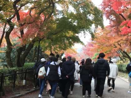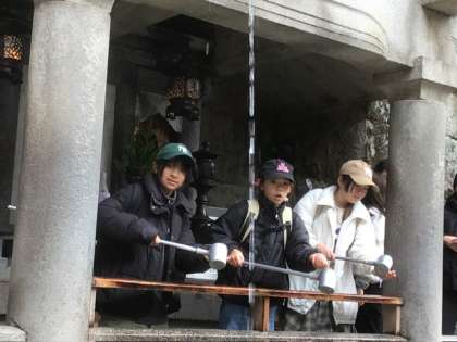 修学旅行15 公開日 2024/12/13 更新日 2024/12/13 各学年から 冬というより晩秋の雰囲気の清水寺。紅葉の中を、音羽の滝の水を飲んだり、おみくじを引いたりしてみんなで楽しみました。このあと、清水坂で4人ずつの班に分かれて最後の班行動です。すごい人混みの中を、班で買い物をして、決まった時間までに集合することができ、本当に成長を感じます(清水坂は、自分のペースで歩けないくらいの人、人…でした)。 この後は京都駅に向かいます。