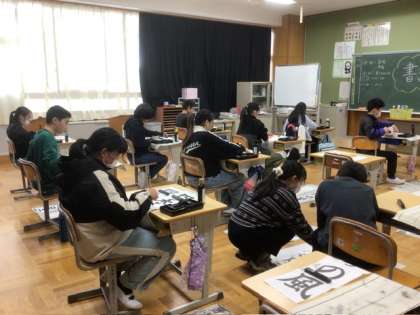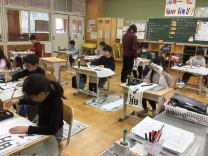 1月7日 書き初め大会 公開日 2025/01/07 更新日 2025/01/07 学校行事 1年生も2年生も、静かに書き初めに取り組んでいます。5、6年生の教室に入ると、墨のいい香りがしました。みんなだまって紙に向かっています。3、4年生の教室では、3年生が初めて毛筆での書き初め大会です。何とかお手本に近い字を書こうと頑張っている様子が窺えました。 限られた時間の中で、自分の納得いく作品は書けたでしょうか。心を落ち着けてじっくりと筆を運ぶみんなの様子に、新年早々 力をもらいました。