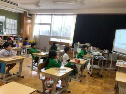 3、4年生は英語の勉強で、お店の人とお客さんのやりとりを通して「what do you want?」「two banana」などの言い方を学んでいました。いろいろ応用することで、英語に親しめそうですね。