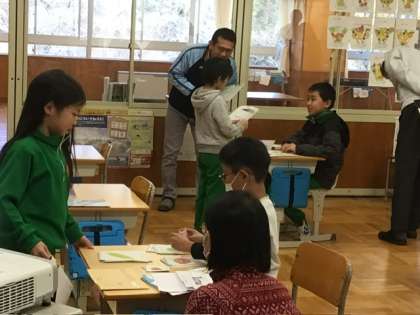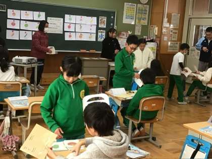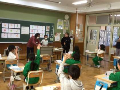 3、4年生で外国語活動の研究授業を行いました。下山中学校からも先生方が授業の様子を見に来てくださいました。