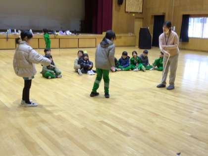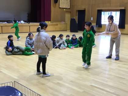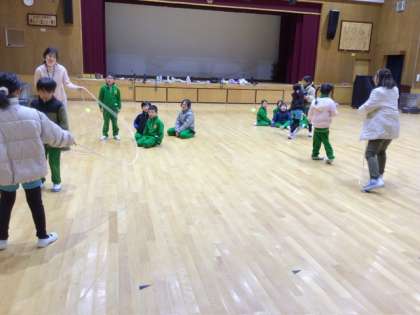 2月21日 授業の様子 公開日 2025/02/21 更新日 2025/02/21 各学年から 1、2年生が元気に歌う声が、職員室まで聞こえてきます。音楽の授業を1階の多目的ホールでやっていたのです。 歌の次は、「おおなみ こなみ」のわらべうたに合わせて1人ずつ長い縄を跳んでいました。歌の最後の「ねこの目」の歌詞に合わせて、縄を両足でまたいで終わるところ、難しいけれどみんな上手にやっていました。