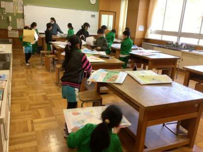 来週は木曜日が祝日なので、今日が1年間の最後の図工です。これまでの作品を返してもらっていました。作品は、子どもたちがすきな絵を描いた作品バッグに入れて持ち帰ります。その後、「いろんな作品ができて楽しかった」「来年は、もっと難しいことをやってみたいな」など、今年度の図工の振り返りをしていました。