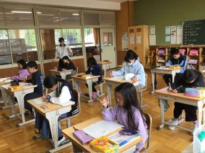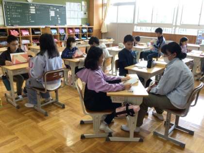 5、6年生は国語の授業。たぶん最初の国語なのでしょう、「何のために国語を勉強するのだろう」ということを、まず考えていました。5年生と6年生のペアで、対話もしていました。いろいろな考えを知ることができて、いいですね。