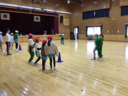 3、4年生は体育で、ボール運びリレーをしていました。みんなの応援が盛り上がって、いつもまにか真剣勝負に。まるで運動会のようでした。