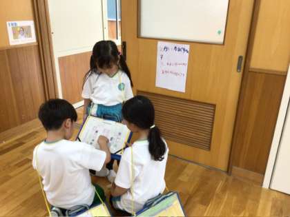 1、2年生は生活科で学校探検をしました。2年生が1年生を案内しながら校内のいろいろな部屋をまわっています。行った部屋の数だけワークシートにシールを貼りました。たくさん貼れましたね。お客様に会ってしっかりあいさつする姿もすてき、2年生が1年生のワークシートにシールを貼ってあげる姿もとてもすてきでした。
