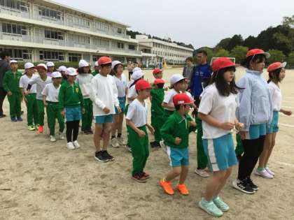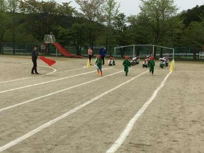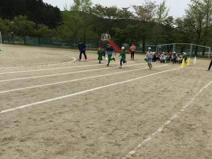 整列し、かけ足で入場します。そして、1年生から順番に、実際に走ってみました。「頑張れ!」「頑張れ!」校庭に、子どもたちの大きな応援の声が響いていました。