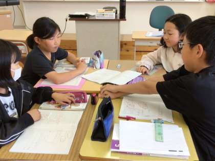 5年生は「3×0.8が3より小さくなるか確かめよう」小数のかけ算の学習です。文章を読んで式を立て、自分のやりかたや考えをグループで説明していました。