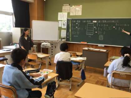 6年生は「分数÷整数の仕方を考えよう」5分の4のものを5人で分けたい時はどうする?という先生の投げかけに、一瞬シーンとしてしまうみんなでした。あとで、どんな考えが出たのでしょうか。