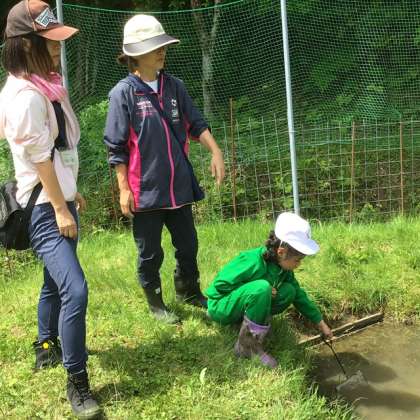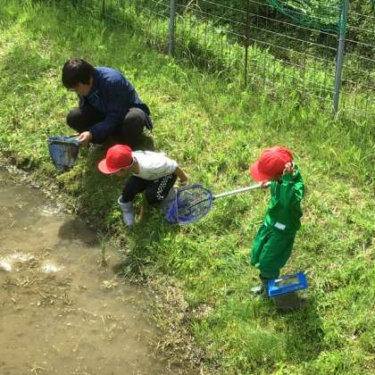 田植えの終わった田んぼはしっかり水が張っていて、おたまじゃくしやかえるなどの生き物をたくさん見つけることができました。いろいろな生き物を入れた虫かごを持って、みんな意気揚々と帰ってきました。