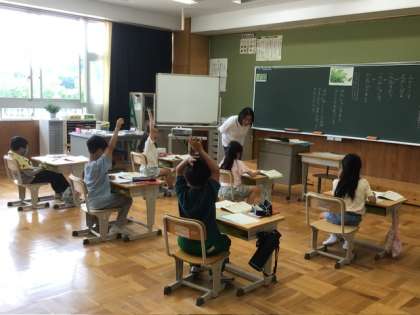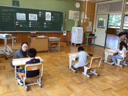 1年生は「なかよくあそぼう」というお話で考える道徳の授業でした。2年生は「たんぽぽのひみつ」についての説明文を読んでいました。暑い日の午後の授業、低学年もがんばっていました。