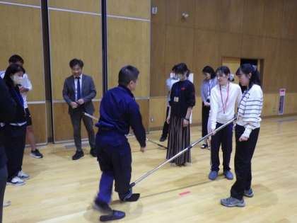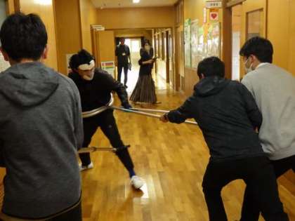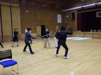 事後には、小中の先生たちが一緒に、感じたことのシェアリング、さすまたの使い方講習会を行いました。