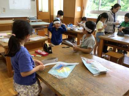 1、2年生は図工の授業です。「わっかでへんしん」わっかを使ってへんしんセットを作ります。好きな生き物、かわいいお姫様、いろいろ変身できそうですね。