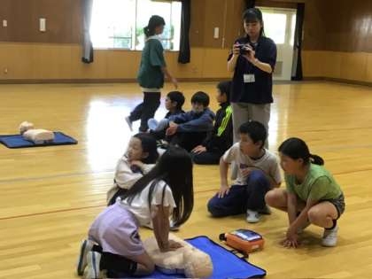実際に胸骨圧迫やAED装着の練習をしました。緊張した様子でしたが上手にやっていました。