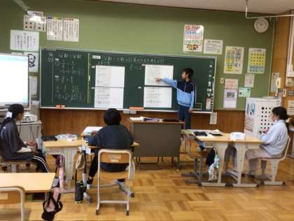 今日は高学年の算数の様子です。5年生も6年生も、少人数ではあっても、人前で自分の言葉で説明することに緊張している様子でした。6年生では、説明の途中に「ここまでいいですか」と聞き手を意識した言葉も使い、聞き手の納得を得ながら、自分の、またはグループで考えた解き方の説明をしていました。