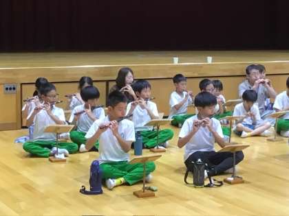 今日は、管別で練習した後、合奏をしました。合奏では、ただ通すだけではなく、フレーズとフレーズの間を考えて演奏することや、周りの子と合わせて演奏することを外部講師の先生にご指導いただきました。周りと合わせる練習として、1番前列の子たちがみんなに向き合った形で練習してみました。初めはそれだけでお互い恥ずかしそうでしたが、自然に「見る」「合わせる」ということに意識が向かうようになり、演奏もちょっとまとまってきました。