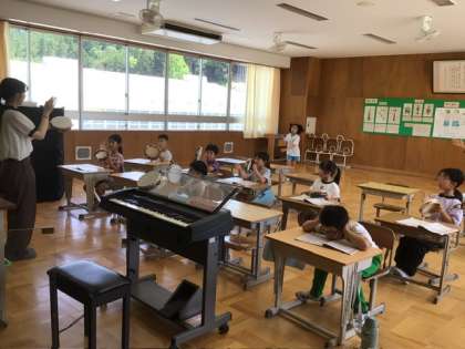 1、2年生は音楽で「リズムで遊ぼう」をしていました。タンバリンを使って上手にリズムを打ちました。