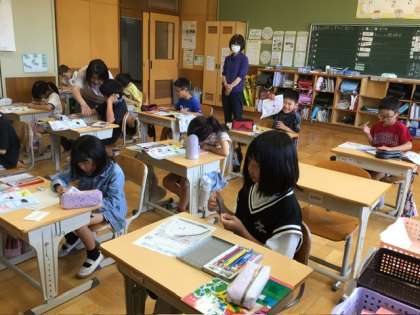 3、4年生は図工で「まぼろしの花をさかせよう」誰も見たことのない、不思議な花を想像して色鉛筆で描きました。学級目標の「たこやき」の形をした花や、人間の形をした花、天体から生えた花、いろいろな花が生まれていました。