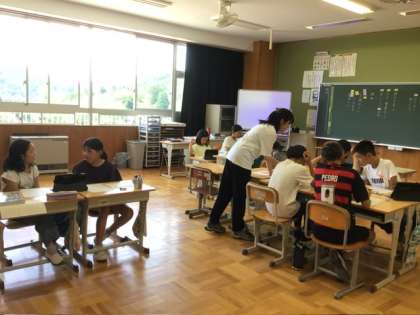 5、6年生は国語で「インタビューの準備をしよう」学校の中の職員さんで、インタビューしたい人が同じ子同士で班を作って実際のインタビュー内容を話し合っていました。「学校事務さんの仕事にはどんなものがあるのか」など、事前にタブレットでその職業について調べてからインタビュー内容を考えていて、高学年らしいです。