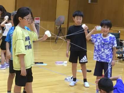 3、4年生は理科の学習「音の伝わり方」で全員での糸電話にチャレンジ。声は空気だけでなく、糸を伝わって相手に届きます。さて、実験ではうまく聞こえたでしょうか。