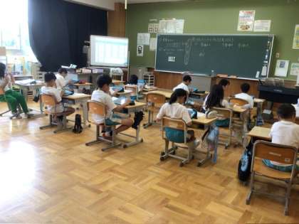 写真は授業の様子です。2年生は国語の学習です。ノートにしっかり詩を書いていました。5、6年生は英語の授業です。今日は静かに聞き取りテストをしていました。3、4年生は音楽の授業です。せんりつを聞いて感じたことを学習用タブレットで書いていましたが、取り組んできた箏の学習が、みんなの書いた内容に生きていると感じました。