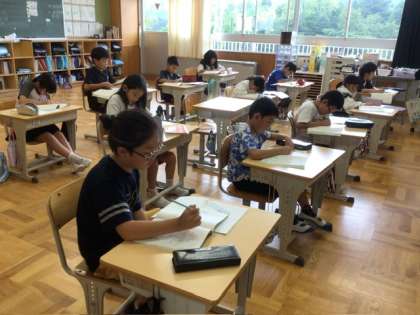 3、4年生がローマ字の勉強をしていました。ローマ字の書き方の決まりを先生に教えてもらって、自分でノートに書きます。みんな真剣です。